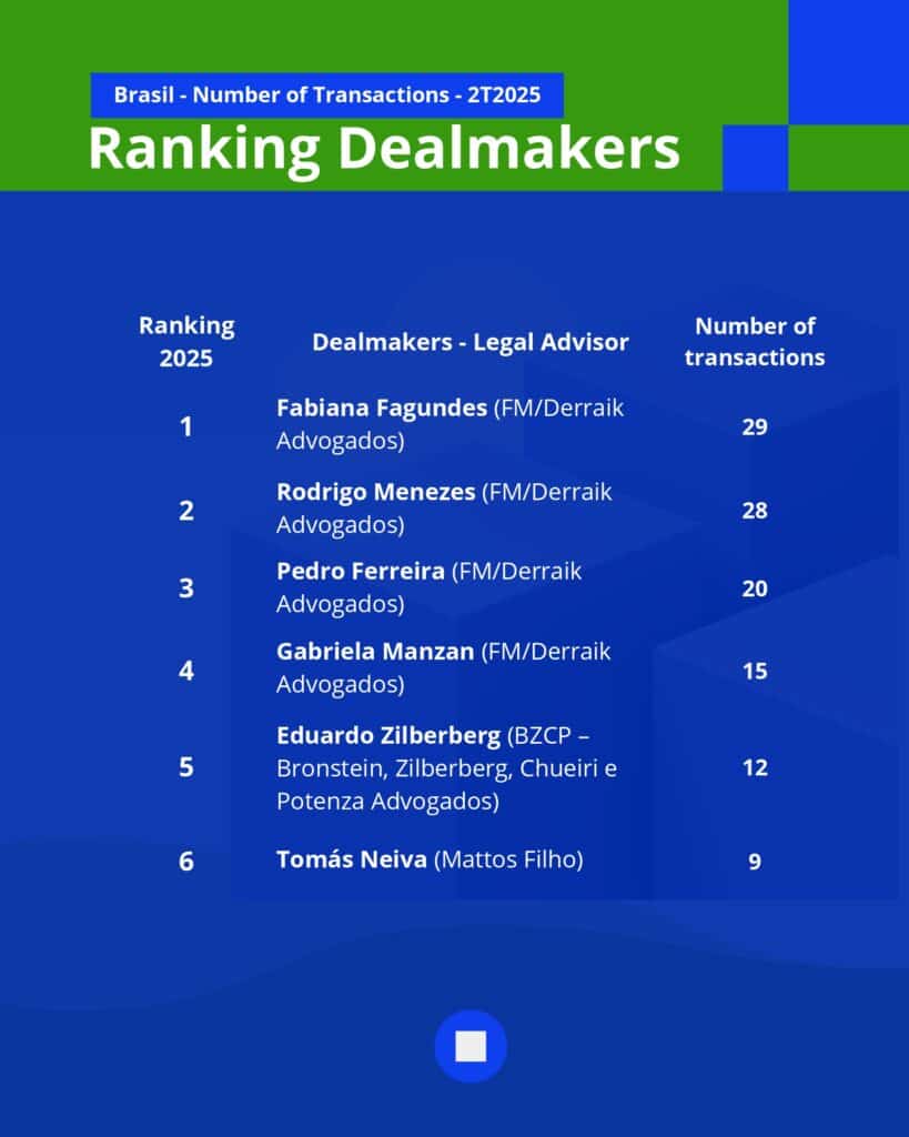 O TTR Data divulgou o ranking dos assessores jurídicos mais ativos no mercado brasileiro de fusões e aquisições (M&A) no segundo trimestre de 2025. A lista, parte do relatório Dealmakers – Assessores Jurídicos 2T2025, destaca os profissionais que mais se destacaram em operações de alto impacto no período.
